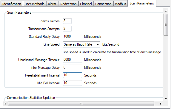 - On the Scan Parameters tab, set the Re-establishment Interval to 10 seconds. If the server's attempts to establish communications with an outstation are unsuccessful, or if communications are interrupted, the server will attempt to re-establish communications via the channel every 10 seconds.