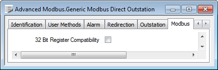 The Modbus protocol specifies that the defined width for registers is 16 bits. However, some devices support registers with a 32 bit width. Use the 32 Bit Register Compatibility check box to enable compatibility with these devices.
