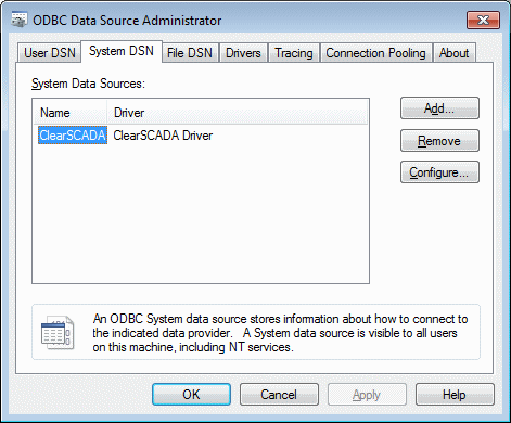 To do this, access the ODBC Data Source Administrator Tool from the Administrative Tools section of the Windows Control Panel (see Configure an ODBC Client - System Connection using a DSN in the Geo SCADA Expert Guide to Client Administration).