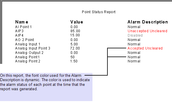 A report uses dynamic colors to indicate the alarm status of each point, at the time that the report was generated.
