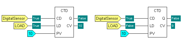 In this Function Block Diagram, the LD output begins as True, and so the CV output is set to be the same as the PV input of 10. The LD output then becomes False and so the counting begins (as the CV output can now be affected by the CD input). The CD input changes from True to False and then back to True again. This causes the CV output to decrease by 1 as the CD input has changed from False to True once. The Q output remains as False as the CV output is above 0. The Q output will only change to True when the CD input has changed from False to True a further 9 times (reducing the CV output to 0). When the Q output changes to True, the counting stops.