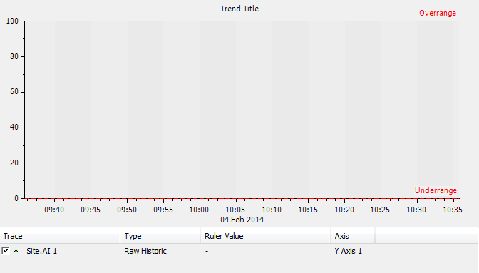 If you look at the y-axis, you will see that it is automatically configured to represent the entire range of values that have been configured for the 'AI 1' point (0 to 100). This is because the y-axis uses the default Mode of Range, which means it represents the configured range for the point.