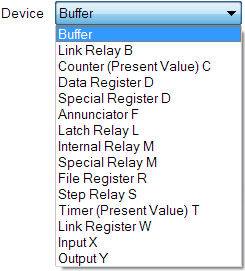 - Device—Use to specify the type of data that is to be scanned. The option that you specify determines the area of memory that the scanner scans on the Mitsubishi Slave or PLC.