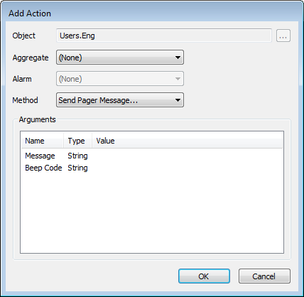 - Use the Method combo box to choose the Send Message or Send Pager Message action as appropriate (the Send Pager Message action is for messages that use the Multitone or TAP protocol). When you have selected the action, you will see that the Arguments section becomes available and it has these fields: Pager Number and Message. There may also be a Beep Code field. (These fields correspond to the properties of the same name when sending a message manually, see Sending a Message Manually).