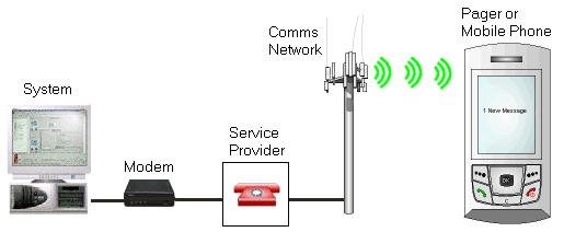With TAP, Geo SCADA Expert sends messages to a pager or mobile phone by using the Pager Driver to communicate with the Service Provider via a modem. This message is then sent by the network service provider which then sends the message to the receiving device over a communications network.