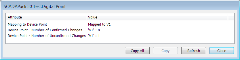For points, this status attribute shows the number of proposed configuration changes to the device point, for which Geo SCADA Expert has received a confirmation message. If the Geo SCADA Expert point is mapped to a point on the device, the attribute also shows the device point name (V1-V8), as shown in the illustration below: