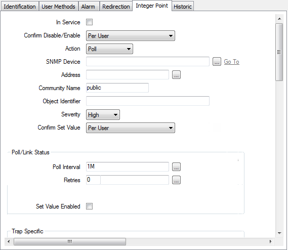 Configure the properties of an integer point using the fields on the SNMP Integer Point Form.
